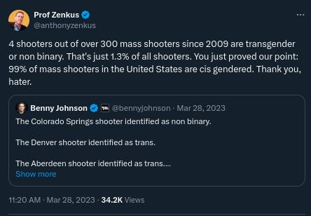 Selectively hyper-focusing on the trans identity of a tiny fraction of perpetrators while ignoring the demographics of the other 99% is a deliberately misleading tactic, not honest analysis.