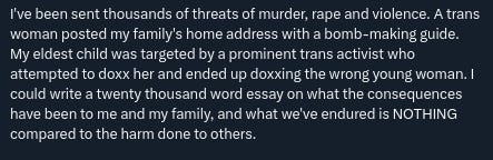 Rowling refers to "a trans woman post[ing] my family's home address with a bomb-making guide" and her daughter being "targeted by a prominent trans activist." She provides no evidence for these allegations, but uses them to tar the entire trans community as threatening. This is a hasty generalization fallacy, attributing the claimed actions of individuals to a whole marginalized group.33