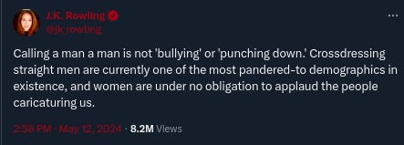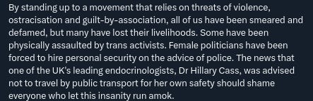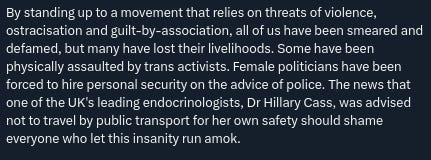 “But endlessly unpleasant as its constant targeting of me has been, I refuse to bow down to a movement that I believe is doing demonstrable harm in seeking to erode ‘woman’ as a political and biological class and offering cover to predators like few before it.”35