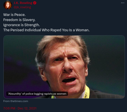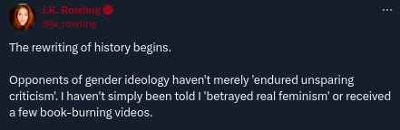 Rowling, J. K. [@jk_rowling]. (2024, December 2). The rewriting of history begins. Opponents of gender ideology haven't merely 'endured unsparing criticism.' I haven't simply been told I 'betrayed real feminism' or received a few book-burning videos [Tweet]. Twitter. https://twitter.com/jk_rowling/status/1863579675877884385 ↩
