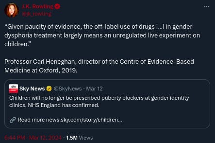 Rowling may believe she is simply asking questions or expressing concerns, though in Rowling’s case I do not extend the benefit of the doubt. But to a trans child already facing hostility and rejection from those around them, hearing that one of their beloved childhood authors thinks people like them are dangerous or deluded is devastating. To a policymaker looking to score points by targeting a vulnerable population, Rowling's words provide ammunition and legitimacy.