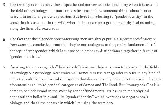 Footnotes 3 and 5 rely on tendentious redefinitions of "gender identity" that bear little resemblance to how the term is used by researchers and clinicians. By attacking these straw man conceptions, Morty avoids reckoning with the reality of gender identity as understood by experts. Furthermore, their assertion about how the term is used in the wild does not line up with reality. This "soul-like ‘gender identity’" rhetoric appears to be an example of a straw man fallacy - misrepresenting an opposing view in an oversimplified or exaggerated form that's easier to discredit. Rather than addressing the actual arguments for transgender identity put forward by trans people, scientists, and major medical organizations, Morty substitutes this “metaphysical belief” caricature as a stand-in for those views.