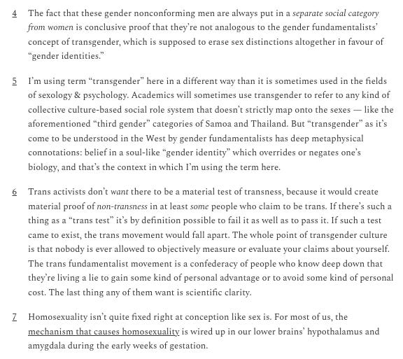 Footnote 6 goes beyond mere scholarly sloppiness into outright conspiratorial ideation. Morty's baseless speculation about the secret motives of trans activists is a revealing glimpse into the mindset behind this piece. What they fail to recognize is that, based on the same evidence and logic, the same case could be made for Gays, Lesbians, and Bisexuals as well - unless their next claim, that the brain has its homosexuality fixed (and what of bisexual people?) has no merit? Because if it does, then it is just a matter of time and technology before we can measure it. In which case, the same questions hold true.
