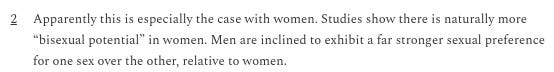 The second footnote gestures vaguely towards "studies" on female sexual fluidity, but fails to cite even one. Such vague, unsupported appeals to scientific authority are a recurring weakness in the article's references. If I keep my hand waving vague enough, I too, can say that “studies” show pretty much anything I want to be true (or false).