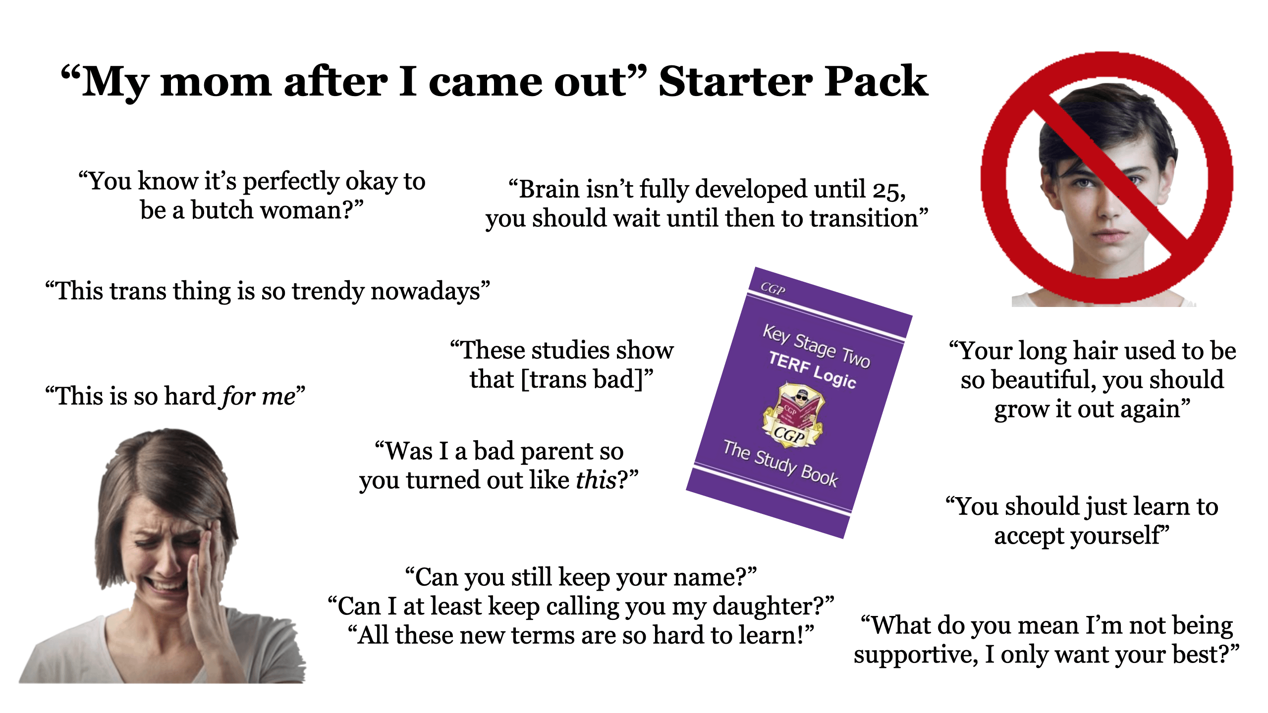 Parents—if your child tells you they are transgender or non-binary, you know it's because they are "confused" and have been "influenced" by social media or peers. That means it's no longer safe to allow them to explore their identity. Ignore the medical professionals and support groups that will teach you how to affirm and support your child, and how much happier and healthier transgender youth are when they are accepted by their families! Doesn't that sound too good to be true? You remember that "basic biology," right? And no, this is not neglect or abuse, because…Transphobe Exception.
