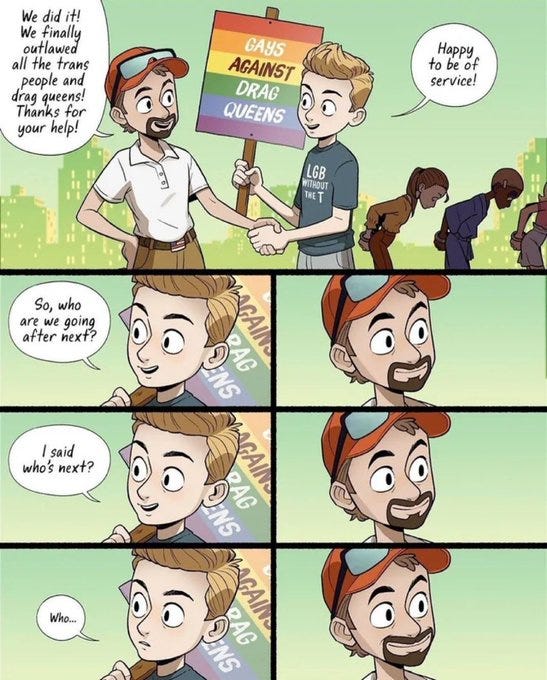This is why so much attention is given by conservatives, in both air-time, money, and effort to recruit any individual or group within the LGBTQ+ community that sow division against various factions within. Looking at you LGB alliance, Genspect, etc. Not only is this an effort to make anti-trans positions legitimate and socially acceptable, it is an effort to use trans folks as a wedge to sow division within the LGBTQ+ community itself, to divide and conquer, through weakening our political power and expose us to legislative attack. The broader conservative political movement has not forgotten nor forgiven the “attack on marriage” or that it has become increasingly more socially acceptable to portray gay relationships and families in mass media such as ads, television shows, and movies. They did not forget about Roe, and we paid dearly for our complacency.