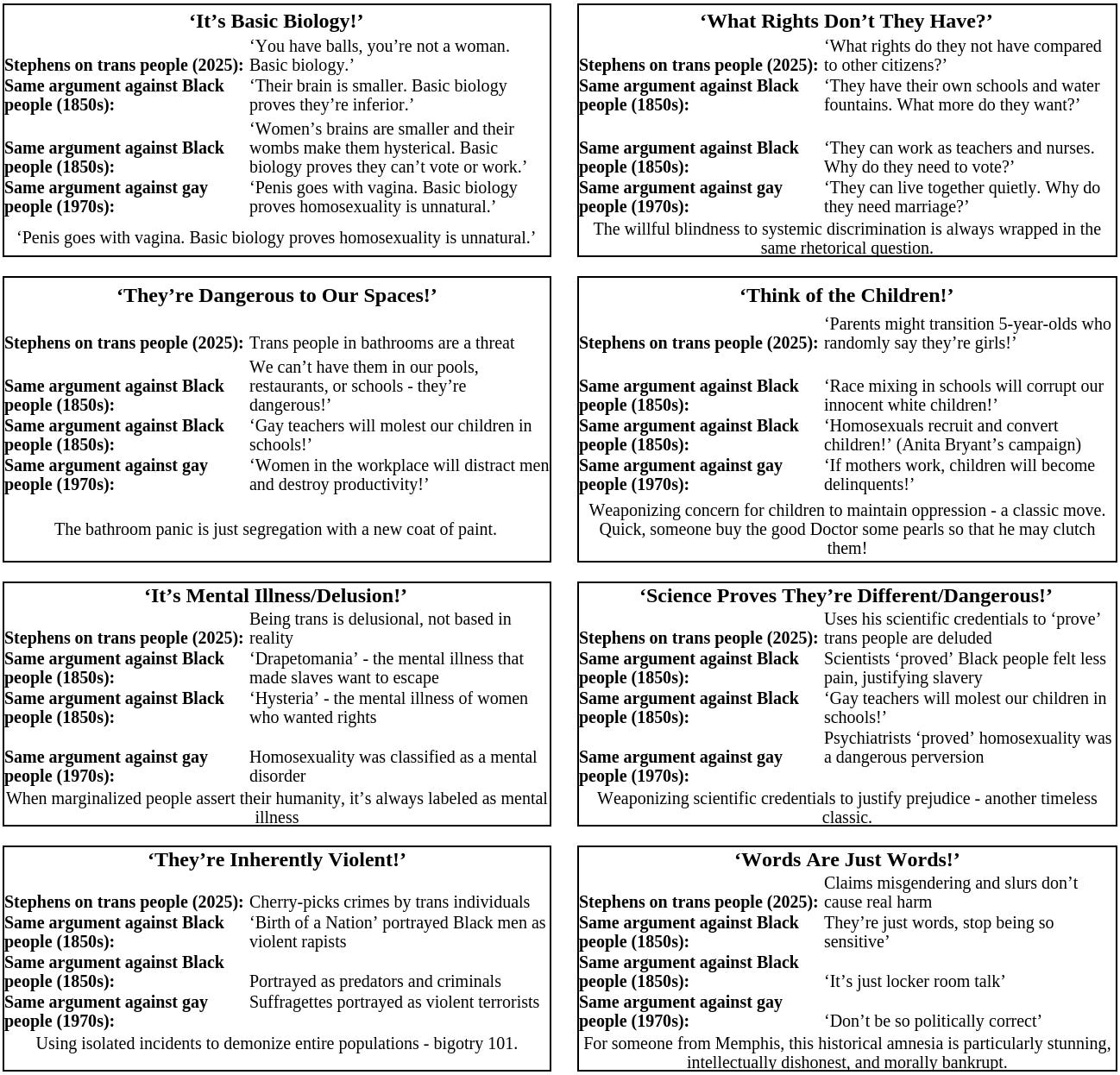 After watching Stephens’ mask slip, it’s worth noting something remarkable: every single argument he makes against transgender people has been used before. Against Black people. Against gay people. Against women. The script never changes - only the target does. Let’s examine this greatest hits collection of recycled bigotry (for the sake of length, I have paraphrased these):